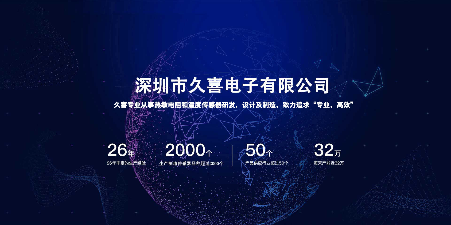 关于我们ABOUT US关于我们ABOUT US深圳市久喜电子有限公司(前身“瑞浪电子”),成立于1994年,工厂位于中国深圳,拥有厂房面积30000平方米,员工1000多人,专业从事热敏电阻销售和温度传感器制造,现是NTC热敏电阻行业知名厂家. 久喜专注于温度传感器的设计和制造,致力追求“专业,高效”,通过ISO9001/IATF16949质量管理体系认证,拥有超过26年丰富的生产经验,拥有多条自动化生产线,目前已生产制造传感器品种超过200个,服务客户数量超过2000家,产品供应行业超过50个,每天产能近40万,20多年来,我们为温度控制和测试系统的大范围消费用品和商业用品应用,提供多样化的温度传感器,为客户提供从设计到生产的一站式个性化服务,为市场持续提供高性能优质产品并在行业中建立了“久喜制造”的品牌式优质信誉。 |